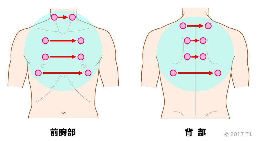 呼吸音は左右の肺をバランスよく聴くことが大切です。 前胸部・側胸部・背部の順に、左右対称に聴き取りましょう。