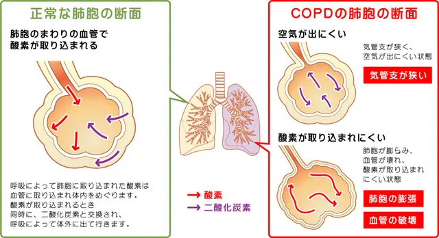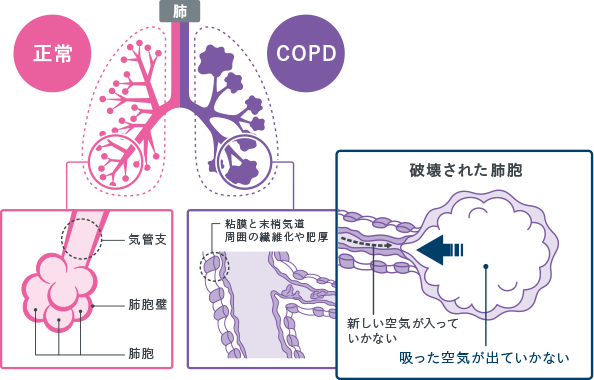 COPDでは気道が慢性的に炎症し、内径が狭くなることで呼吸音が変化します。