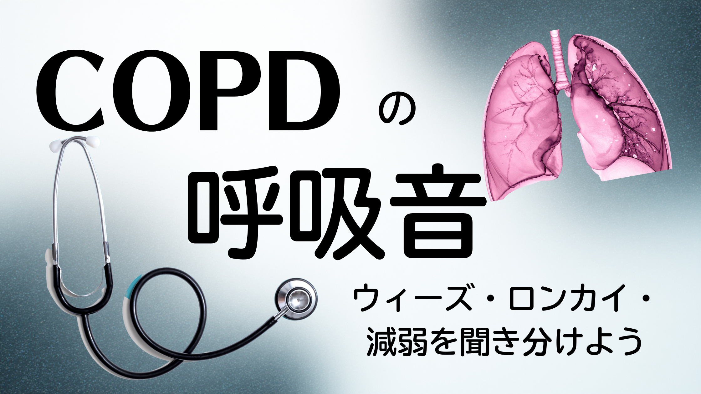 COPD(慢性閉塞性肺疾患)では、気道が狭くなったり痰が貯留することで、特徴的な呼吸音が聴こえます。
