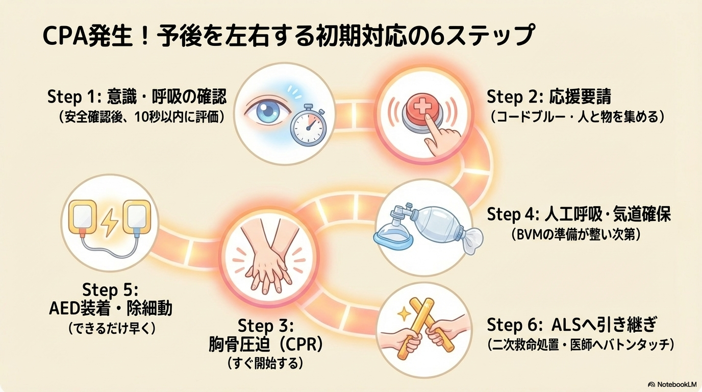 CPA対応は「安全確認→反応評価→応援要請→CPR→AED」の流れが基本であり、これは国内ガイドラインでも標準化されています。