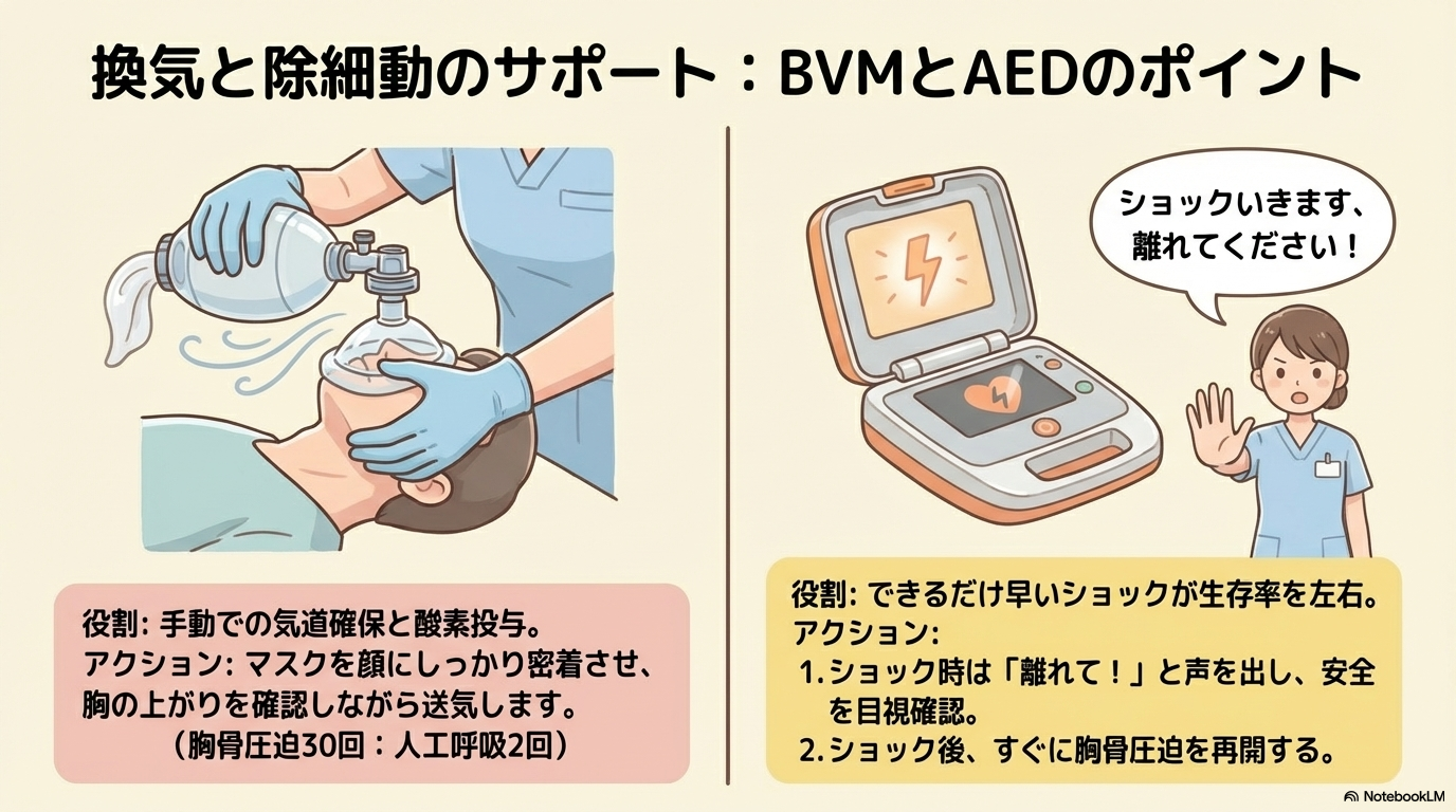 ただし、準備が整うまでは胸骨圧迫のみでもOKであり、圧迫の中断を避けることが優先されます。