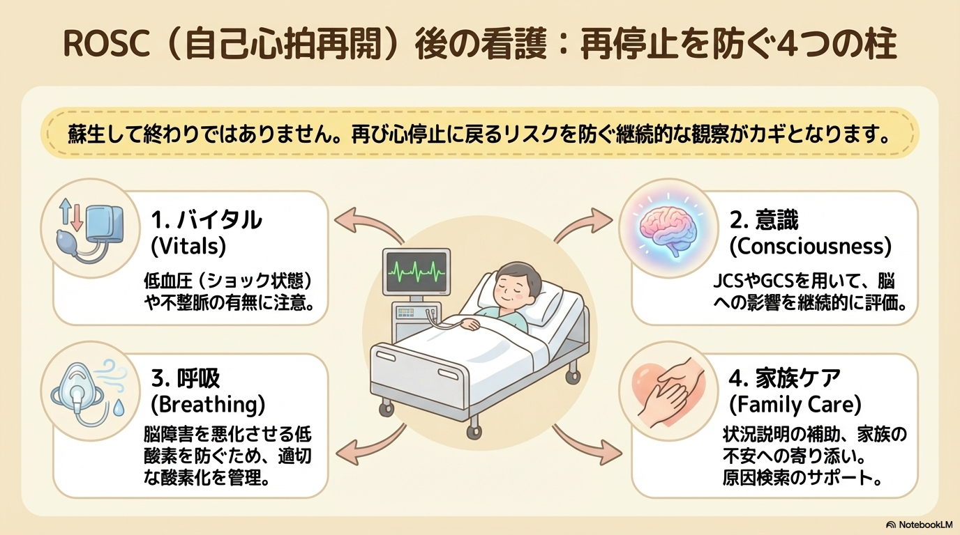ROSC後は循環が不安定になりやすく、急激な変化に注意が必要です。