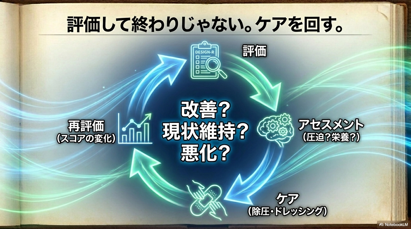 DESIGN-R評価は「点数をつけるもの」ではなく、褥瘡の状態を客観的に判断し、ケアに直結させるためのツールです。