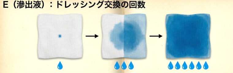- E(滲出液)が多い → 吸収力の高いドレッシング材へ変更