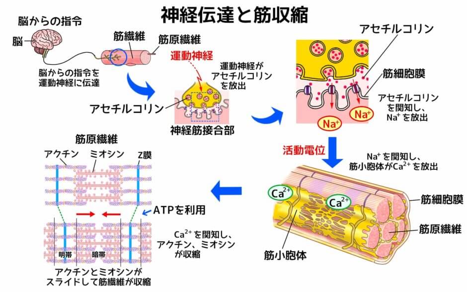興奮収縮連関とは「神経の電気信号が筋肉の収縮(動き)に変わる仕組み」のこと。