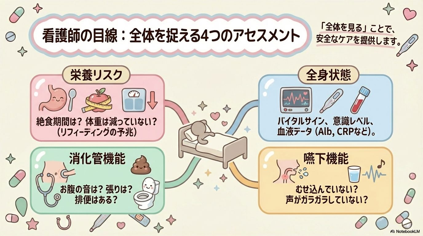 同じ“絶食明け”でも、術後なのか、消化管出血後なのか、誤嚥リスクがあるのか、長期低栄養なのかで、見るべきポイントは変わります。
