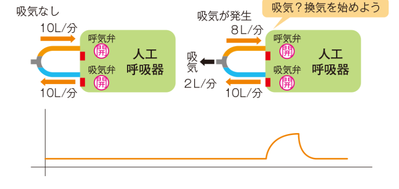 人工呼吸器では、患者さんが「息を吸いたい」と思ったタイミングに合わせて、呼吸器が空気を送り出す必要があります。