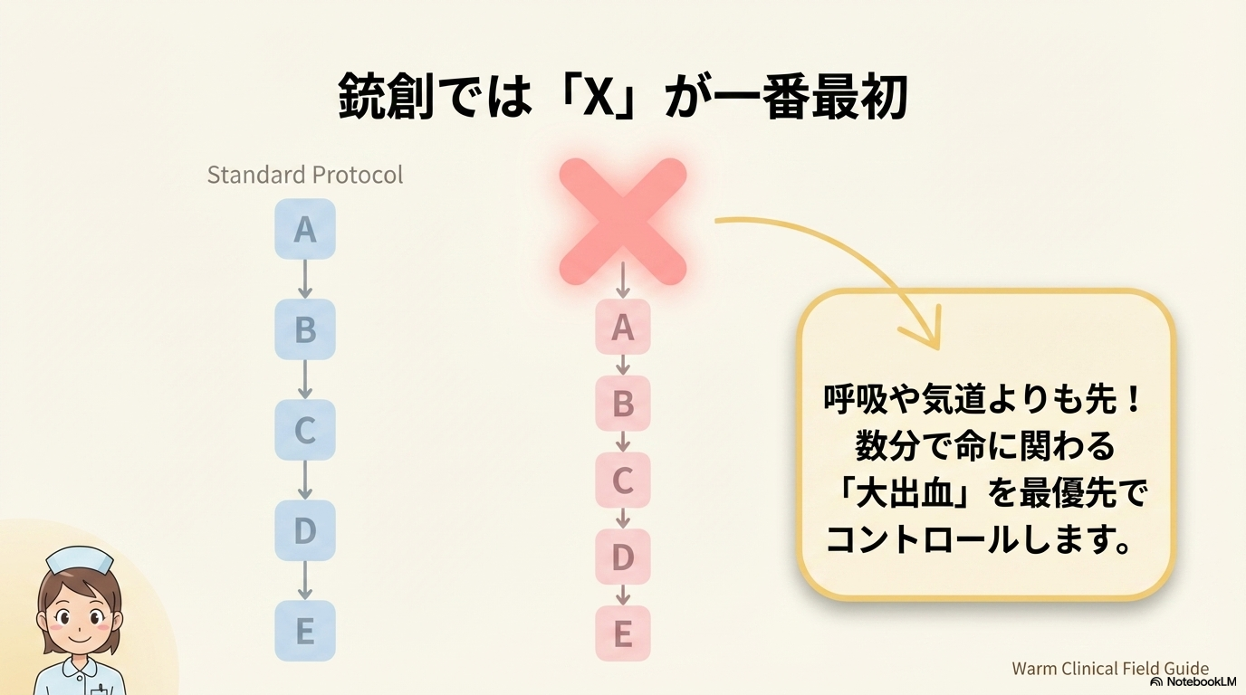 なぜなら、気道や呼吸よりも先に、大量出血で命を落とすリスクが高いためです。