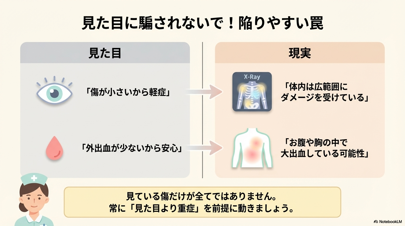 銃創で最も多いミスの一つが、「傷が小さい=軽症」と判断してしまうことです。