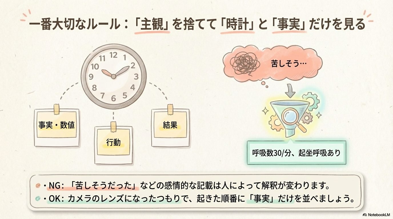 急変時の記録でありがちなミスが、「主観的な表現」です。