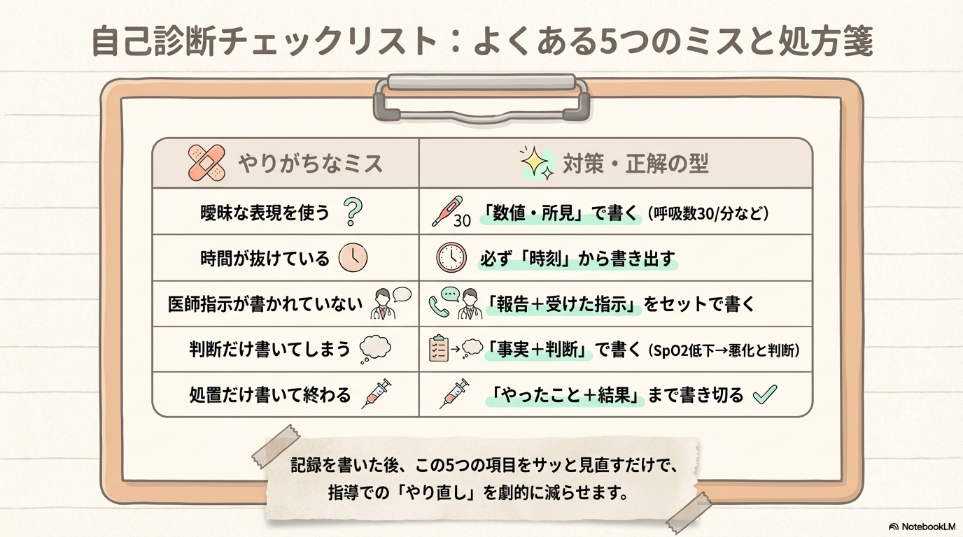 処置を書いて終わってしまうのもよくあるミスです。