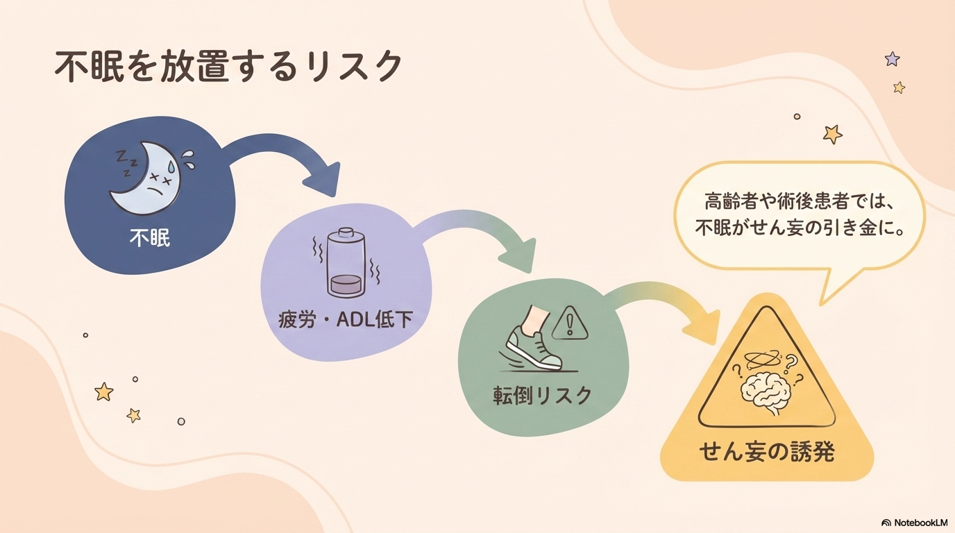 また、特に高齢者や入院患者では、不眠がせん妄につながるリスクもあるため、早めの対応が重要です。