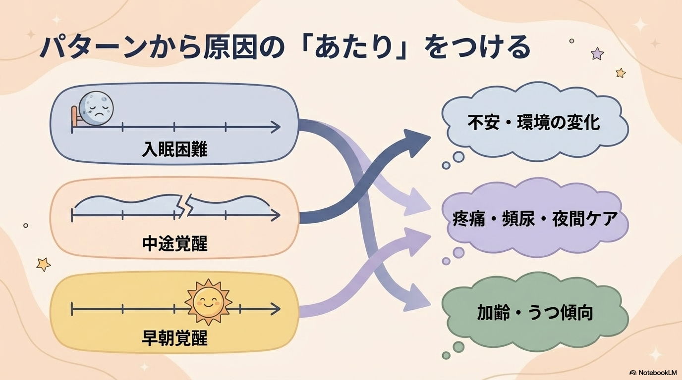 たとえば、入眠困難であれば不安や環境の影響を考えやすく、中途覚醒であれば夜間のケアや頻尿などが関係している可能性があります。このように、不眠のタイプによって原因の当たりがつくのがポイントです。
