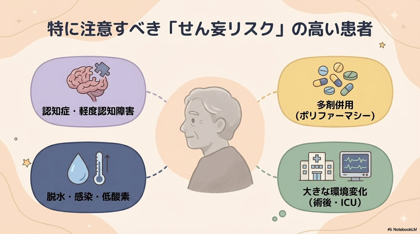 特に入院患者や高齢者では、せん妄予防とセットで考えることが重要になります。