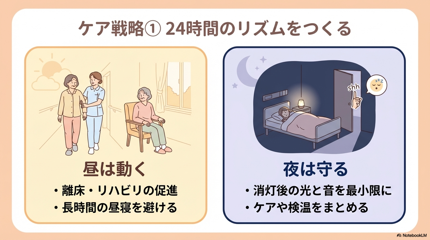 - 環境調整(光・音・夜間ケアの工夫)