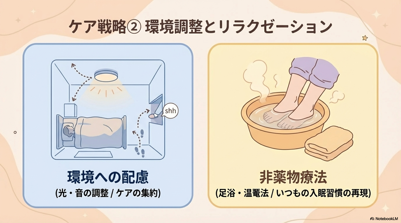 - 睡眠薬に頼らない具体的な看護ケア