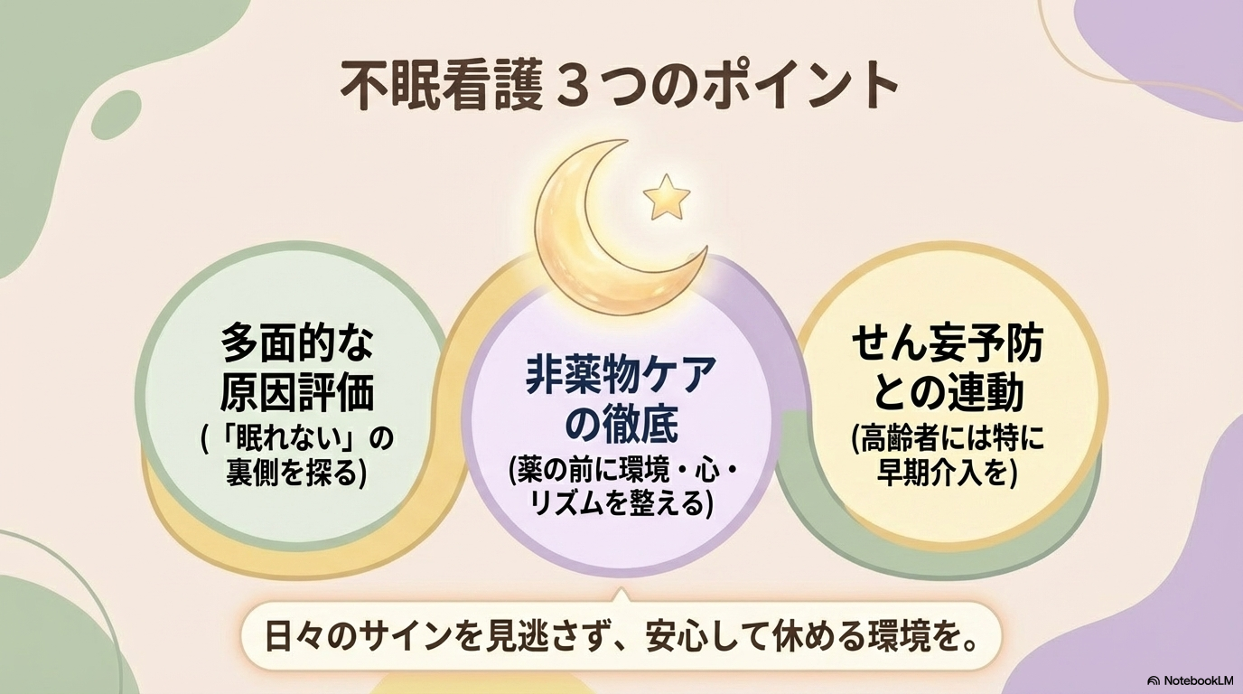 不眠の看護は、「原因を多面的にアセスメントし、環境・生活リズム・心理面を整える非薬物ケア」が基本です。
