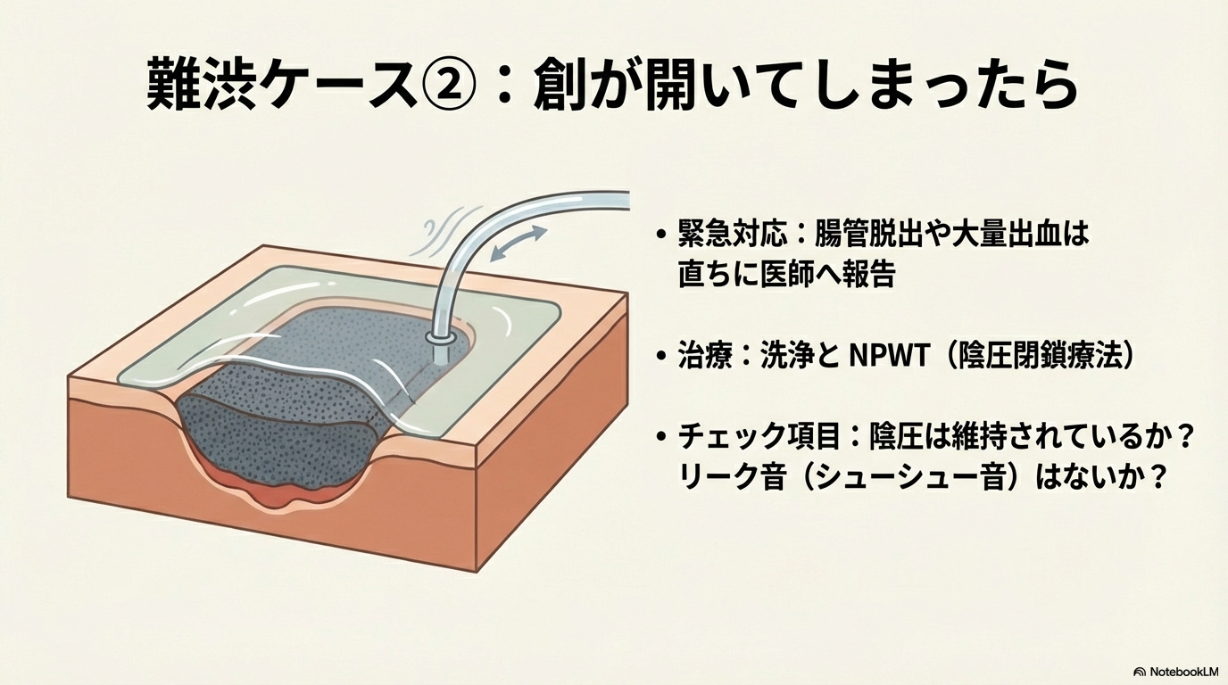 腸管露出や大量滲出があれば直ちに医師報告します。