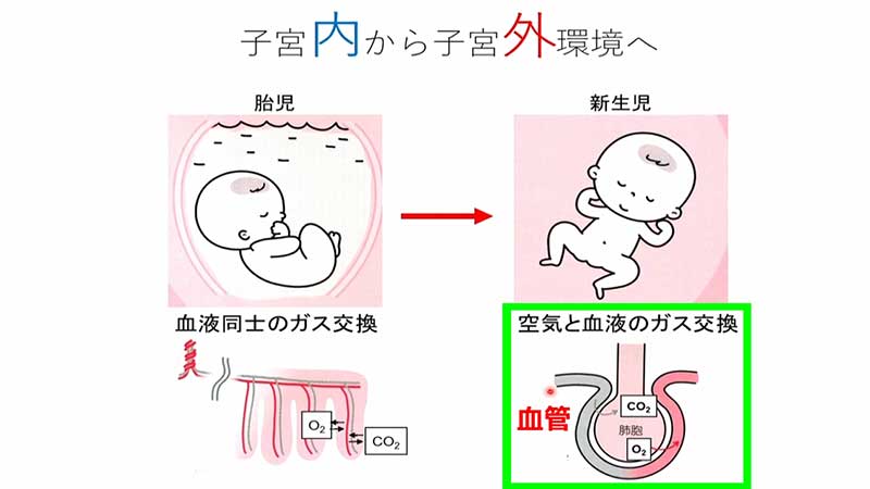 新生児は出生直後から、胎内で胎盤を介して行っていたガス交換から、肺を使った呼吸へと急激に切り替わります。
