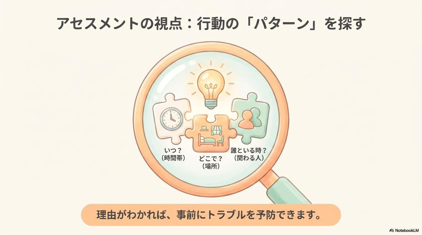 「行動を見る」のではなく「パターンと背景を見る」ことがアセスメントの本質です。