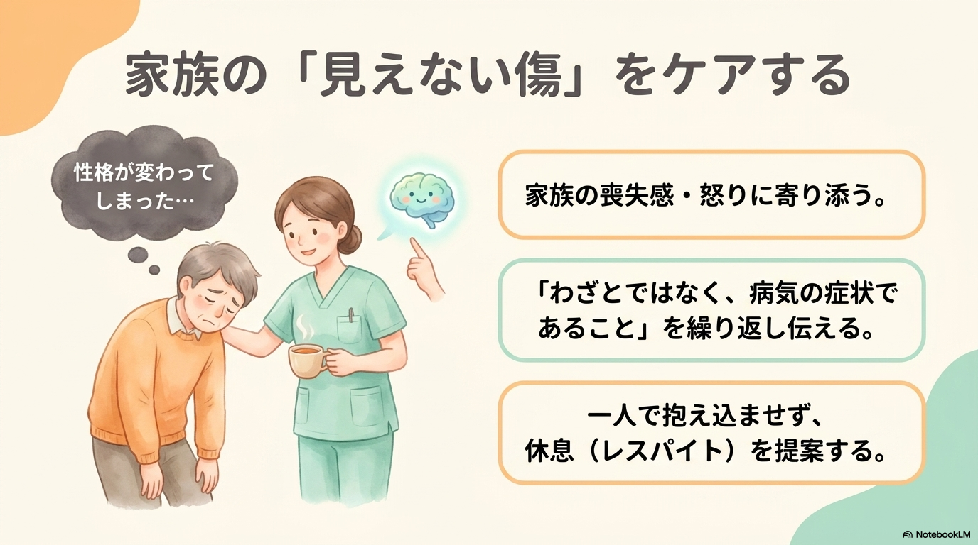 これにより、家族の「怒り」や「責める気持ち」が軽減されやすくなります。