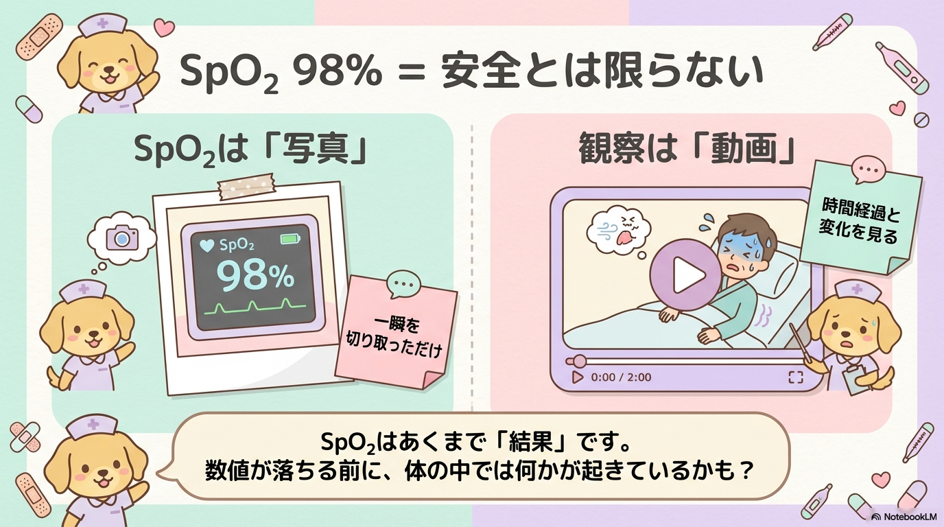 「え、SpO₂は98%あるのに…?」とヒヤッとした経験、ありませんか?🩺
