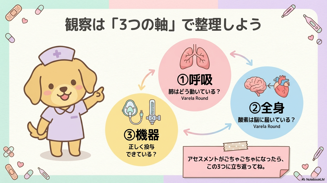 - 観察は「呼吸・循環/全身・機器」の3軸で整理する