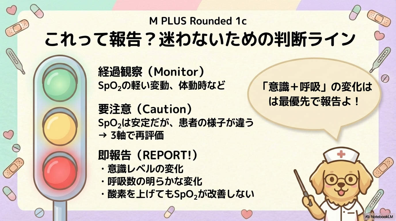 SpO₂が正常でも、ここが変われば報告対象と考えます。