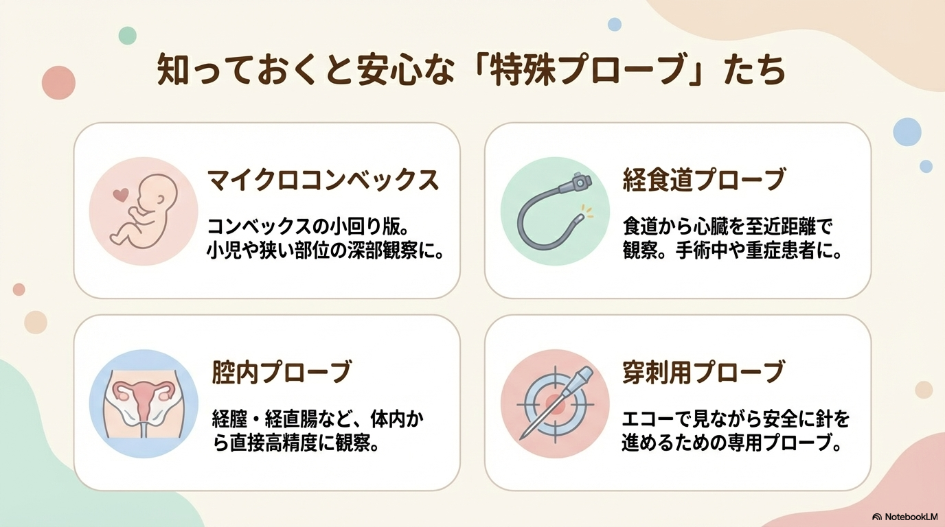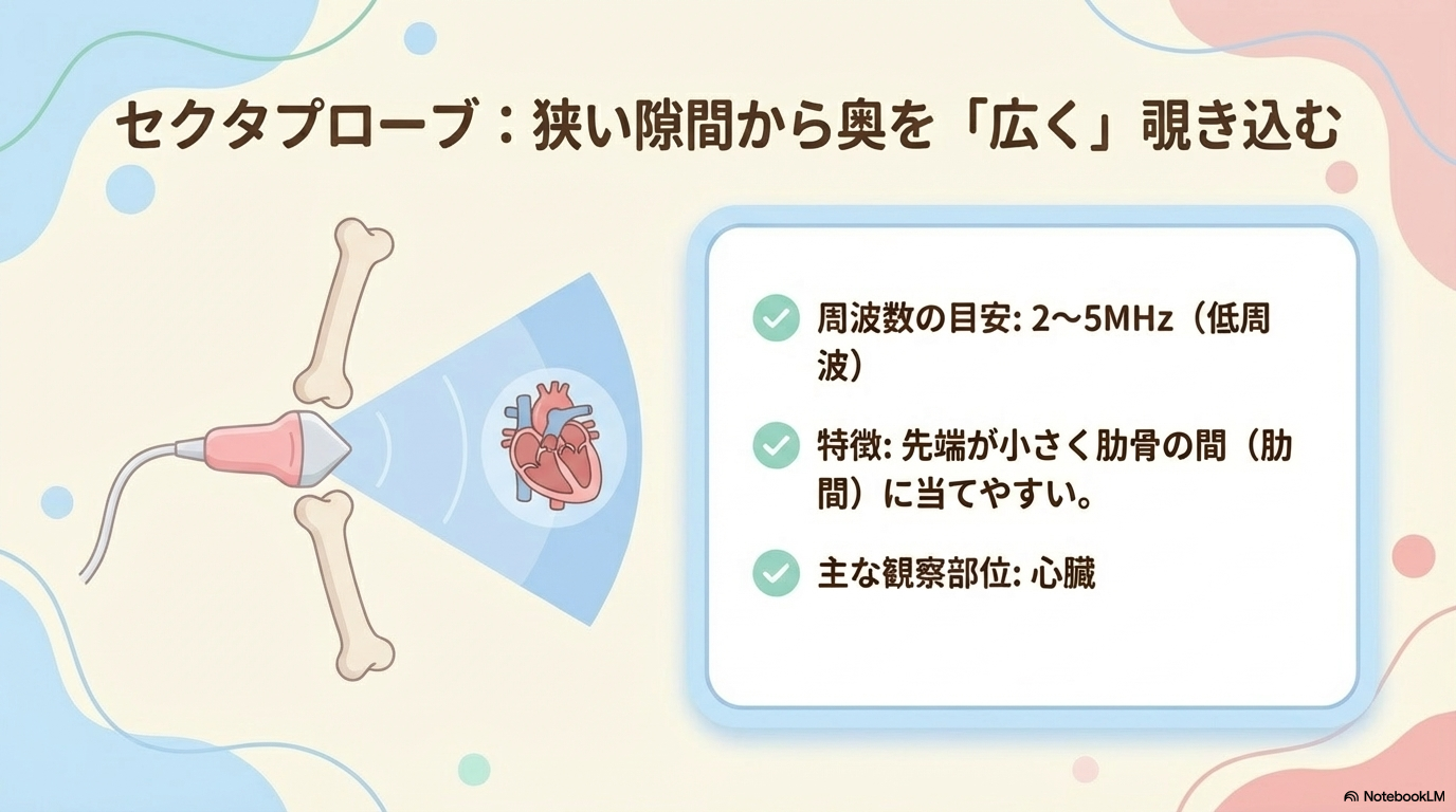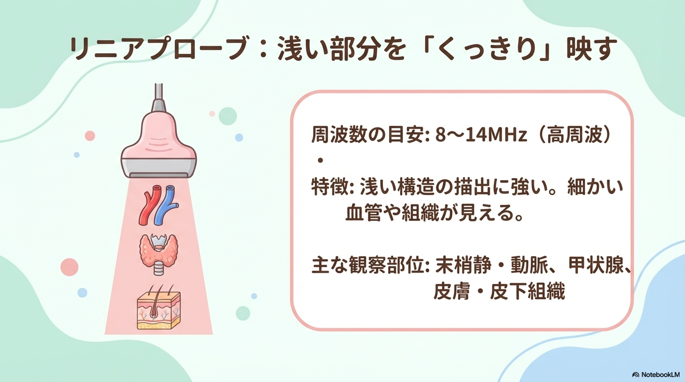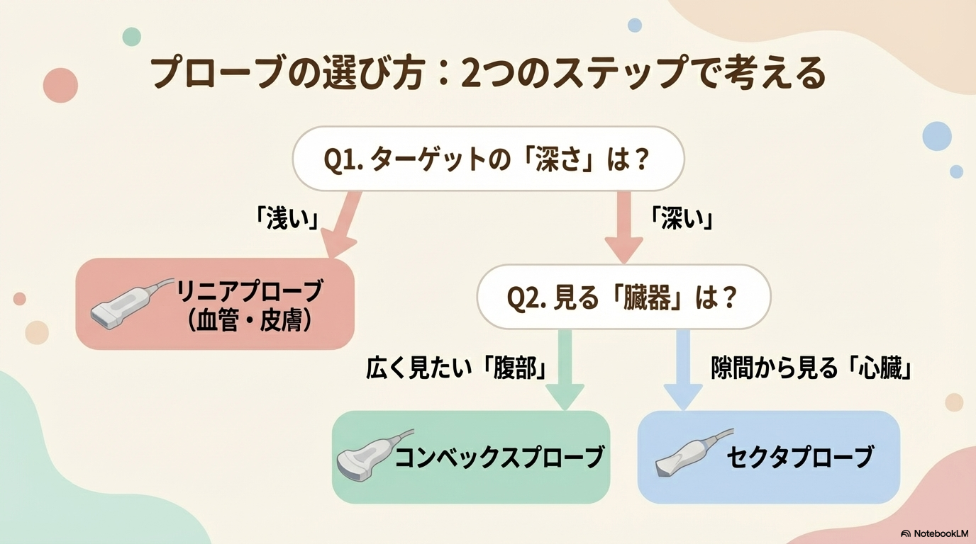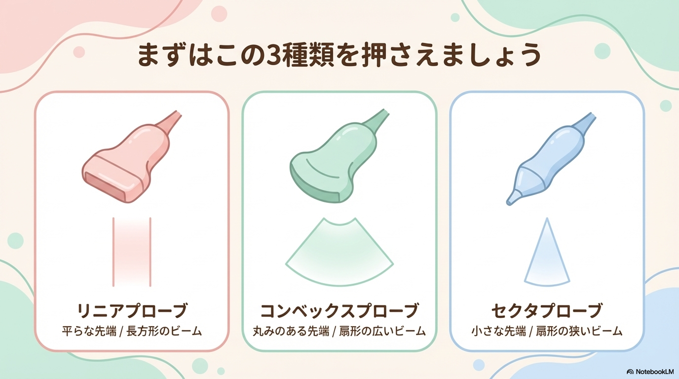 プローブは「深さ」と「観る部位」で選ぶのが基本で、まずはリニア・コンベックス・セクタの3種類を押さえればOKです😊