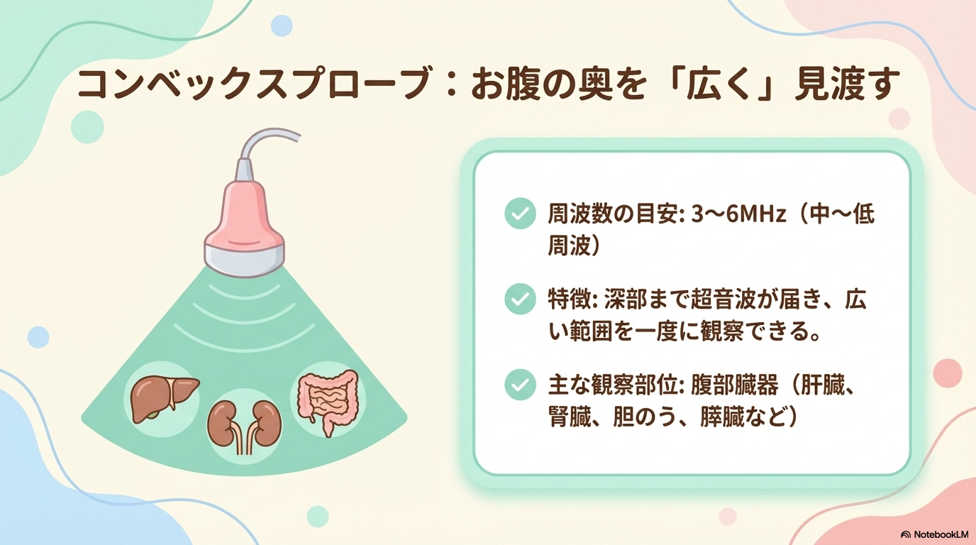 | コンベックス型 | 丸みがあり広く見える | 3〜6MHz(中〜低周波) | 腹部臓器(肝・腎など) |