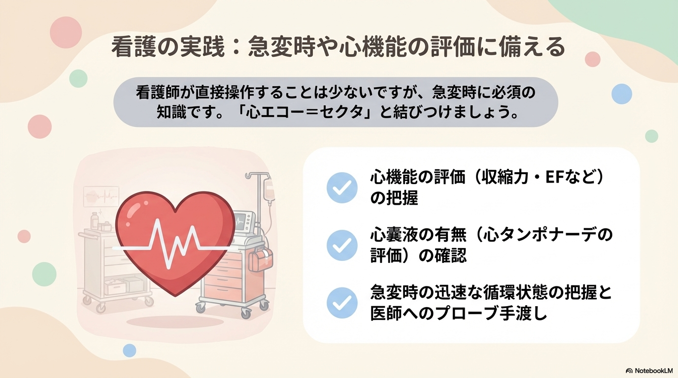 特に急変時には、「今心臓がどう動いているか」を評価するために使われます。