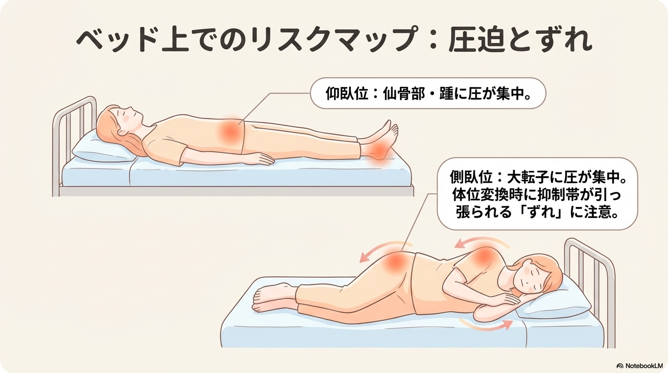 - 側臥位:大転子や肩に圧が集中