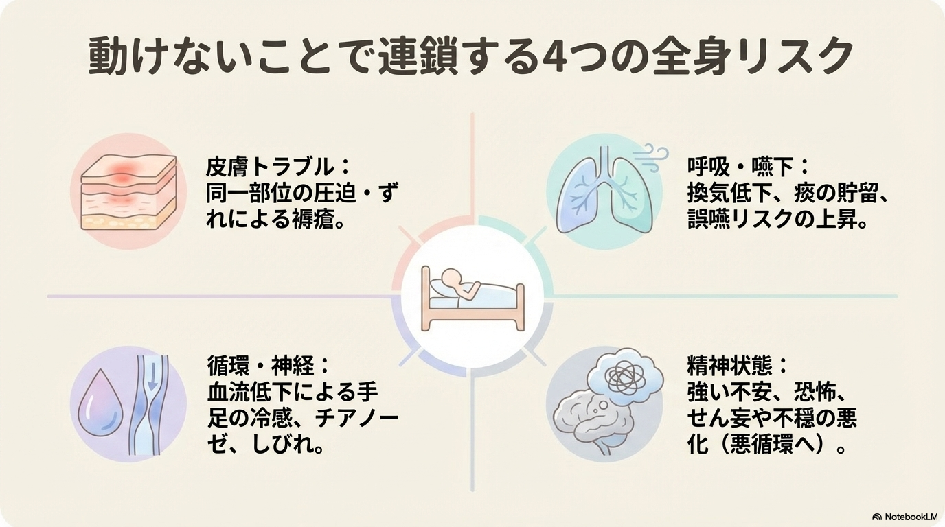 - 褥瘡や循環障害などの身体的リスク