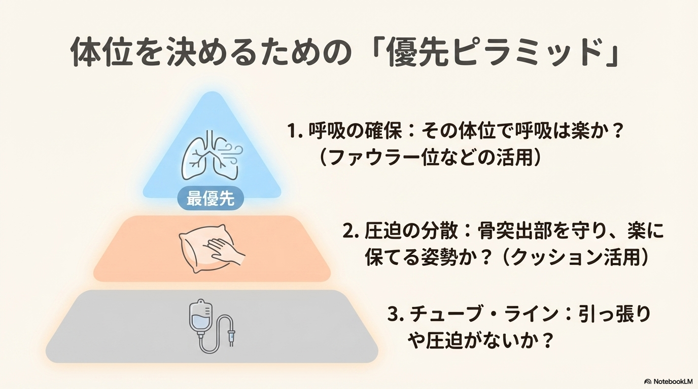 いきなり体位を整えるのではなく、全身状態を踏まえて判断することが大切です。