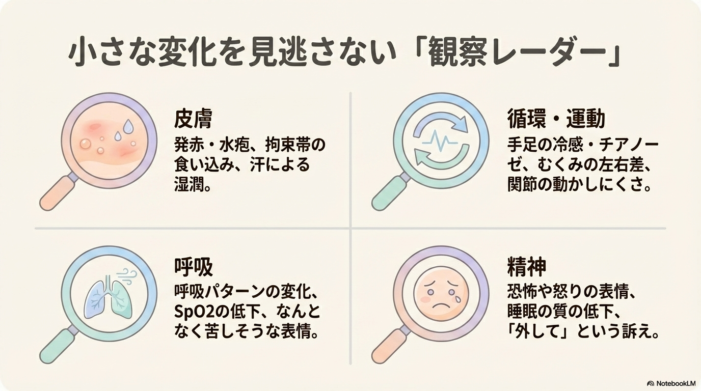 特に四肢拘束では、固定部位に負担がかかりやすいため、こまめな観察が欠かせません。