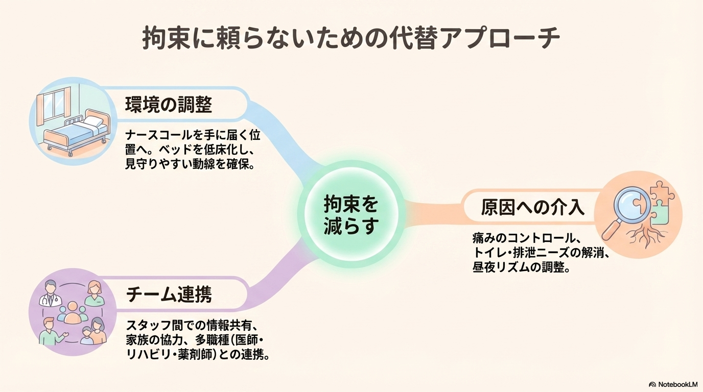 拘束を減らすためには、「まず他の方法を考える」という視点がとても大切です。