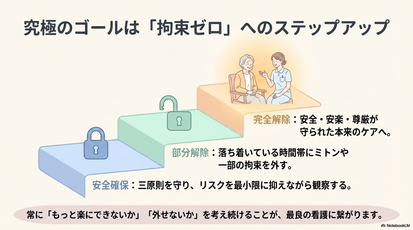 そして、拘束はあくまで一時的な対応であり、できる限り減らしていくことが求められます。