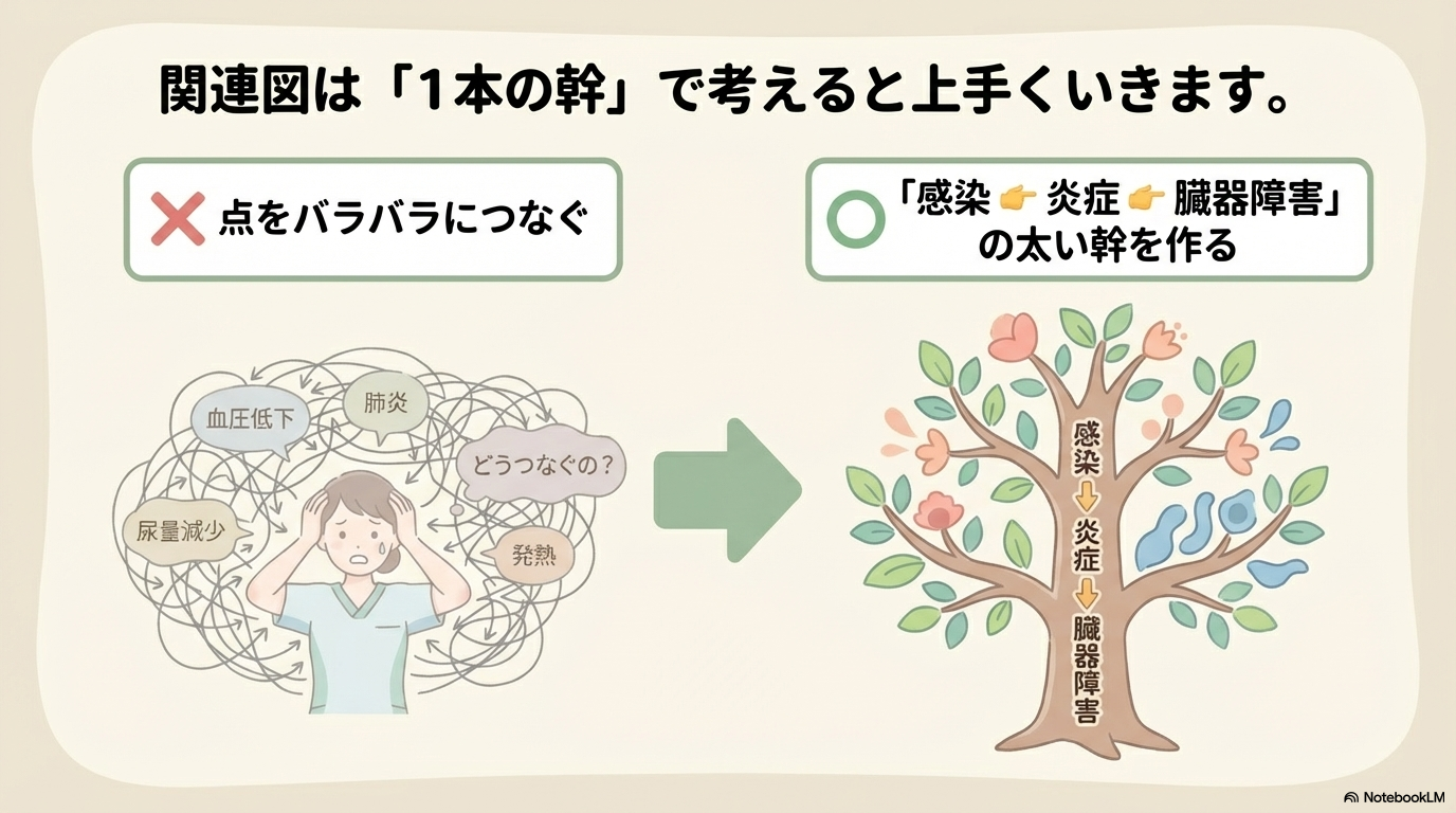 敗血症の関連図で一番大事なのは、バラバラに書かないことです。