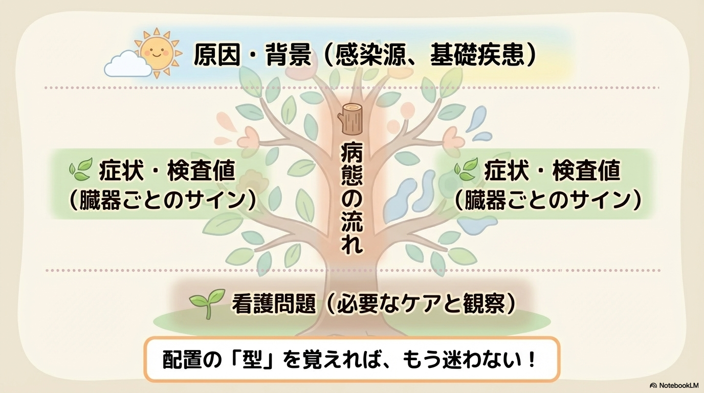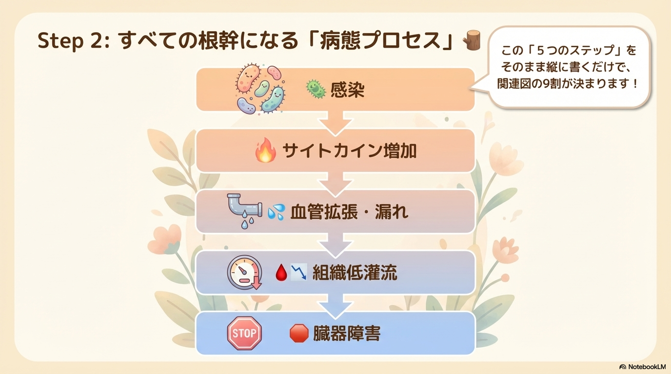 「感染→炎症→循環→臓器」という流れを軸にすれば、自然と全体がつながっていきます。