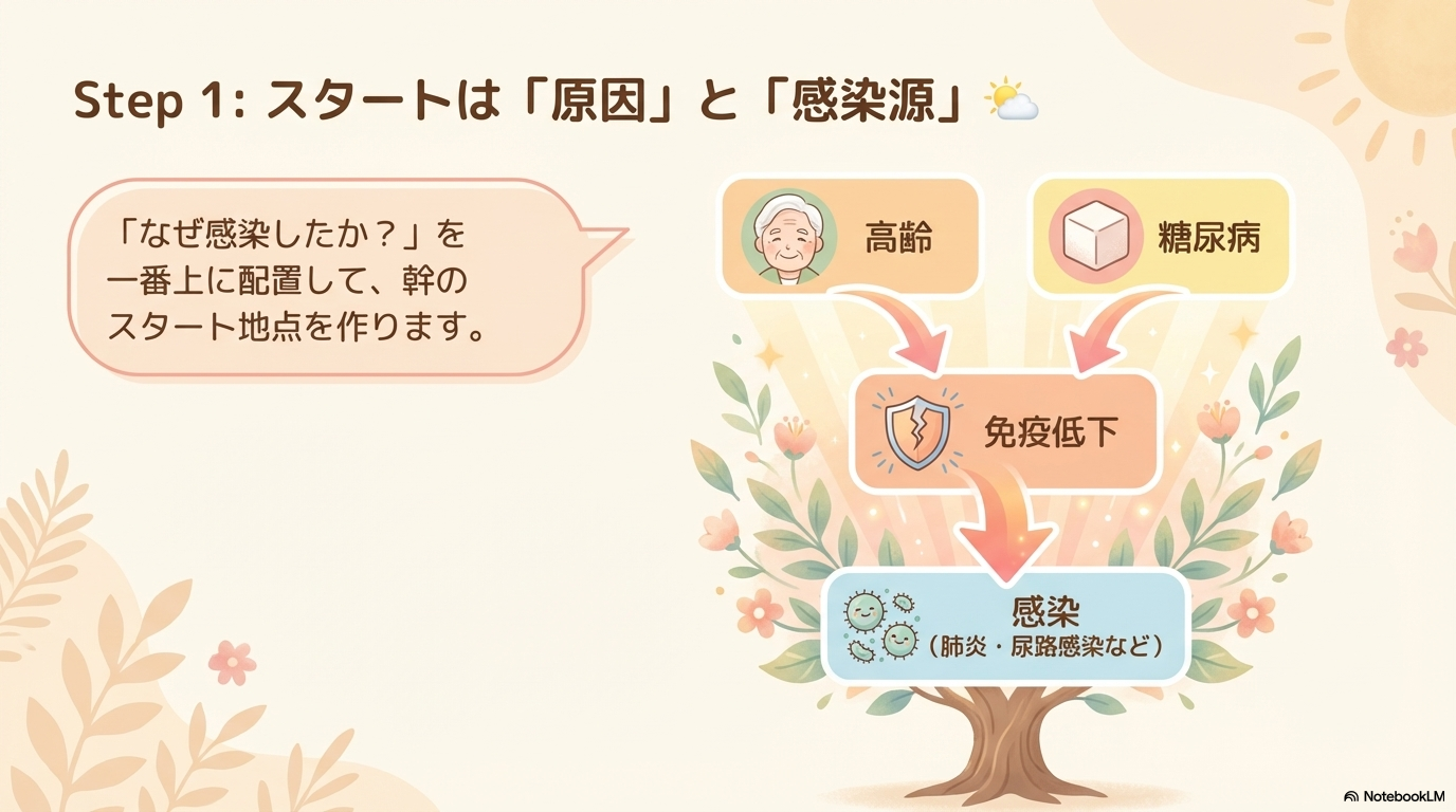 これらから感染へ矢印をつなぐことで、「なぜ起きたか」が明確になります。
