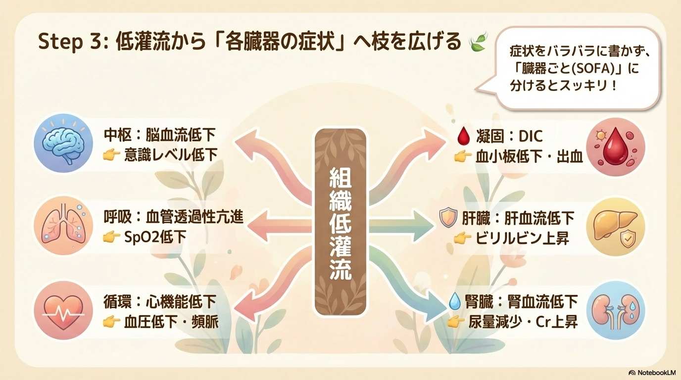 - 感染→炎症→循環不全→臓器障害の流れが幹になる