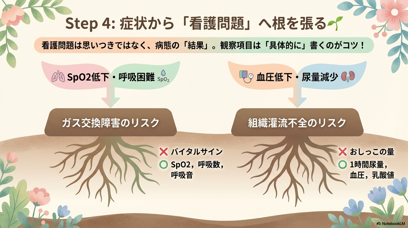 この「病態→症状→問題→観察」の流れができていれば完璧です✨
