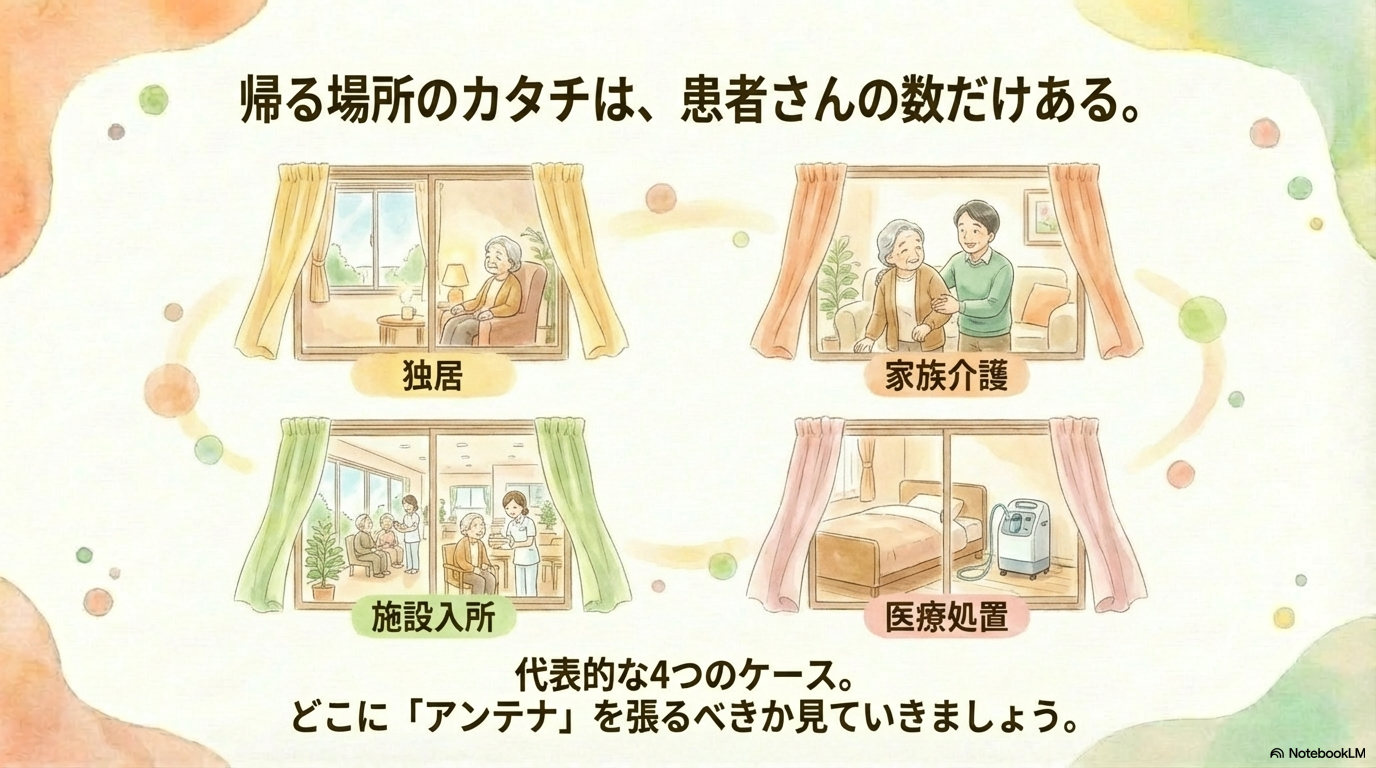 このケースでは、「教える」だけでなく「安心して生活できる環境を整える」ことが、退院支援の大きなポイントになります。
