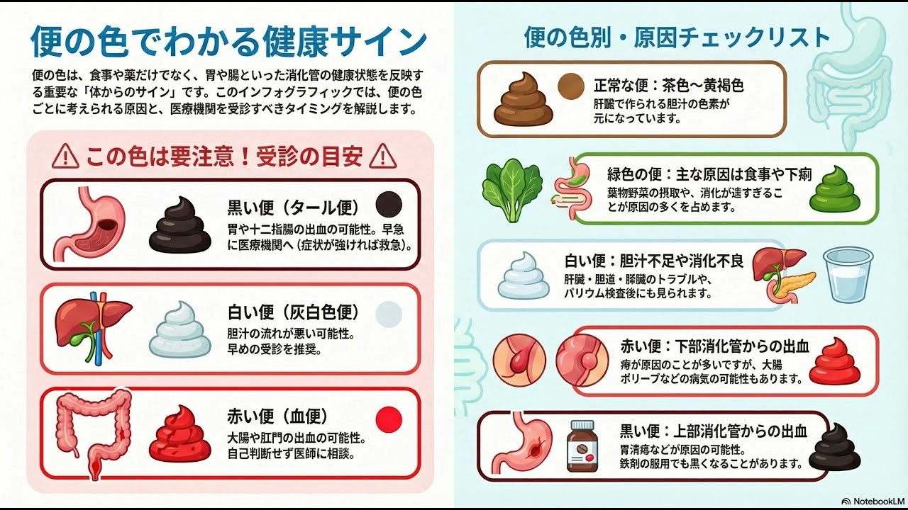 - 便色は「色」ではなく経過・背景とセットで判断する
