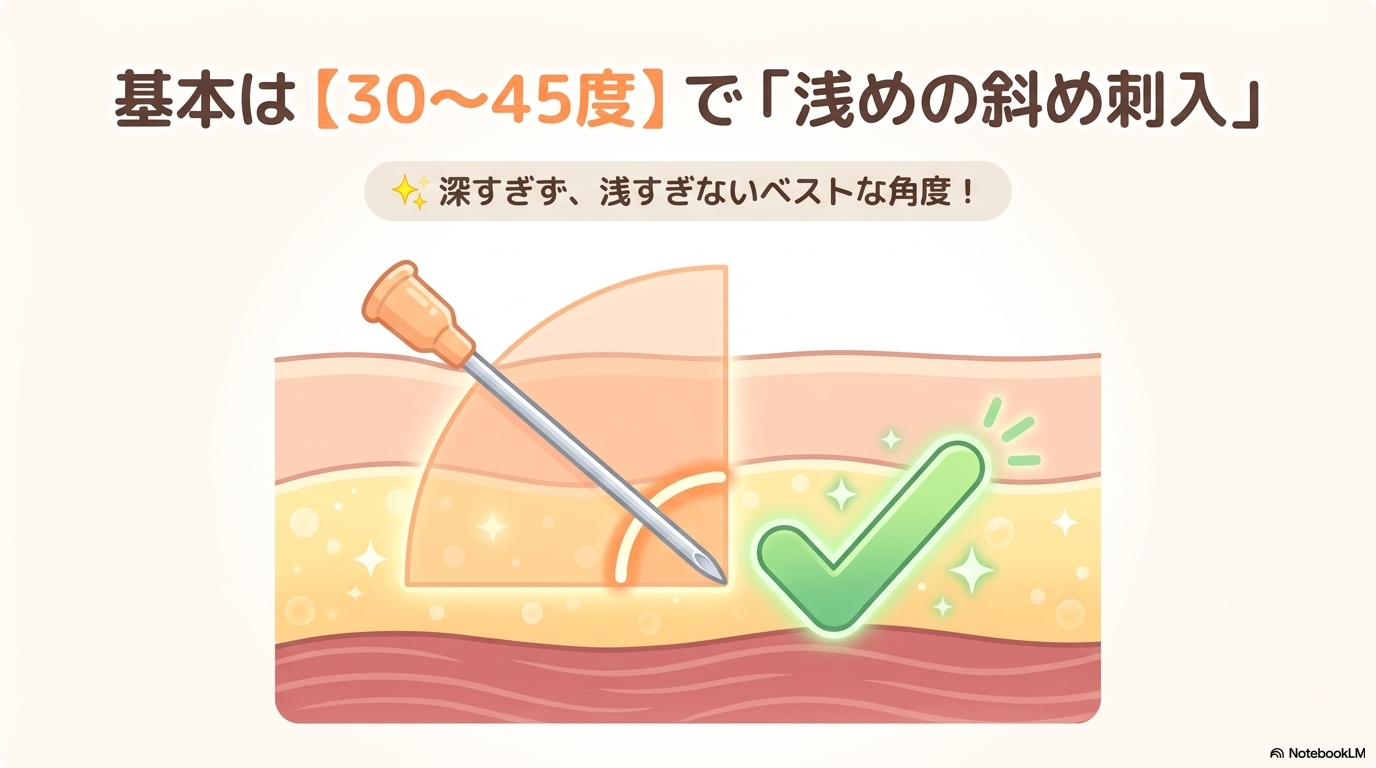 深すぎても浅すぎてもトラブルの原因になるため、「やや浅めの斜め刺入」を意識することが大切です😊