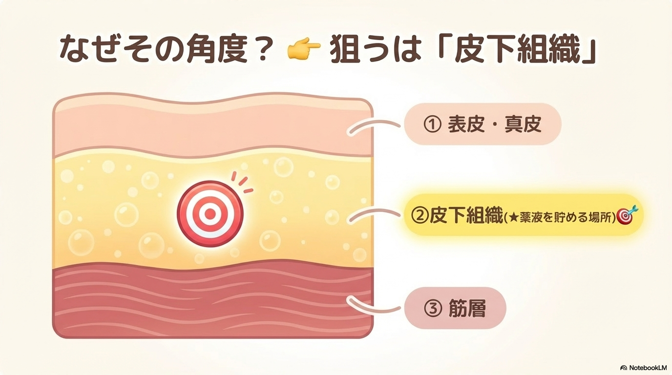 この角度は、皮膚の下にある皮下組織(脂肪層)に適切に針先を留めるために設定されています。