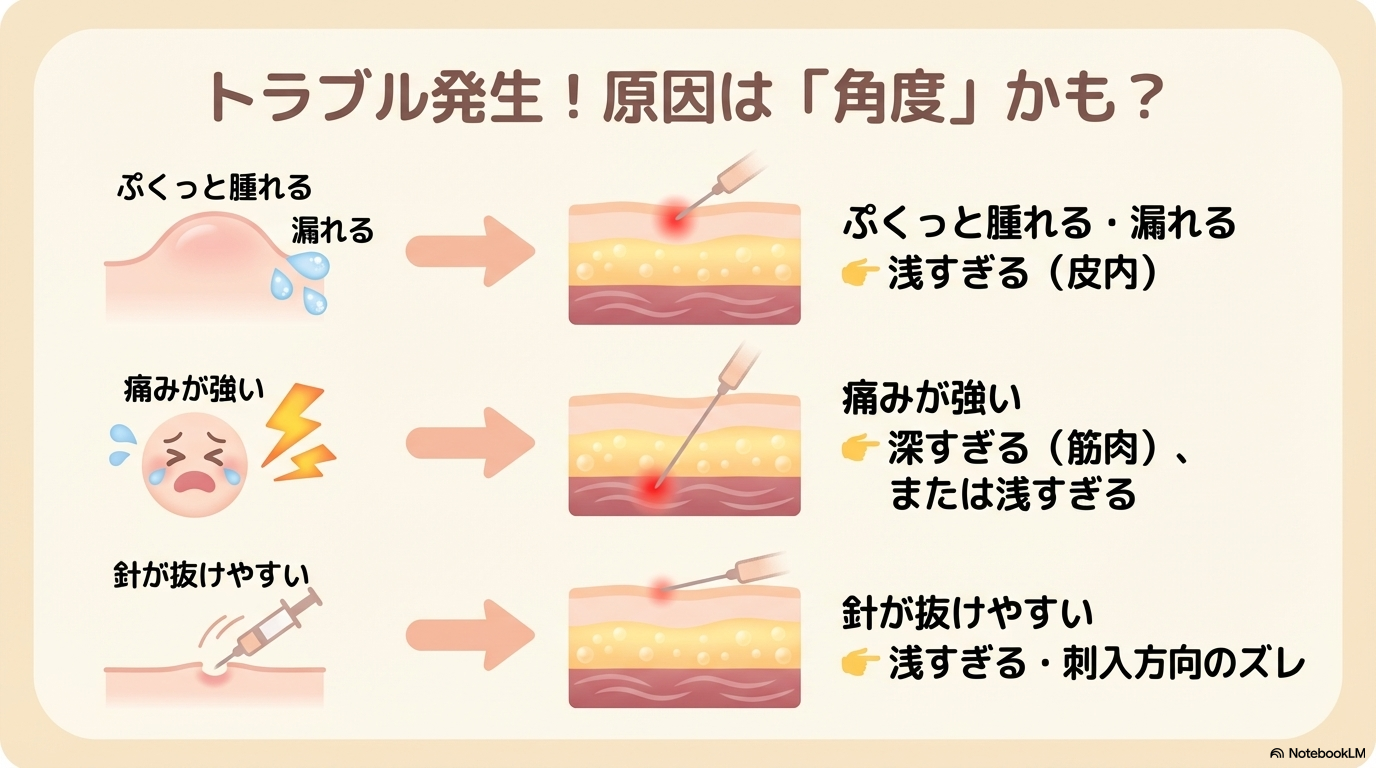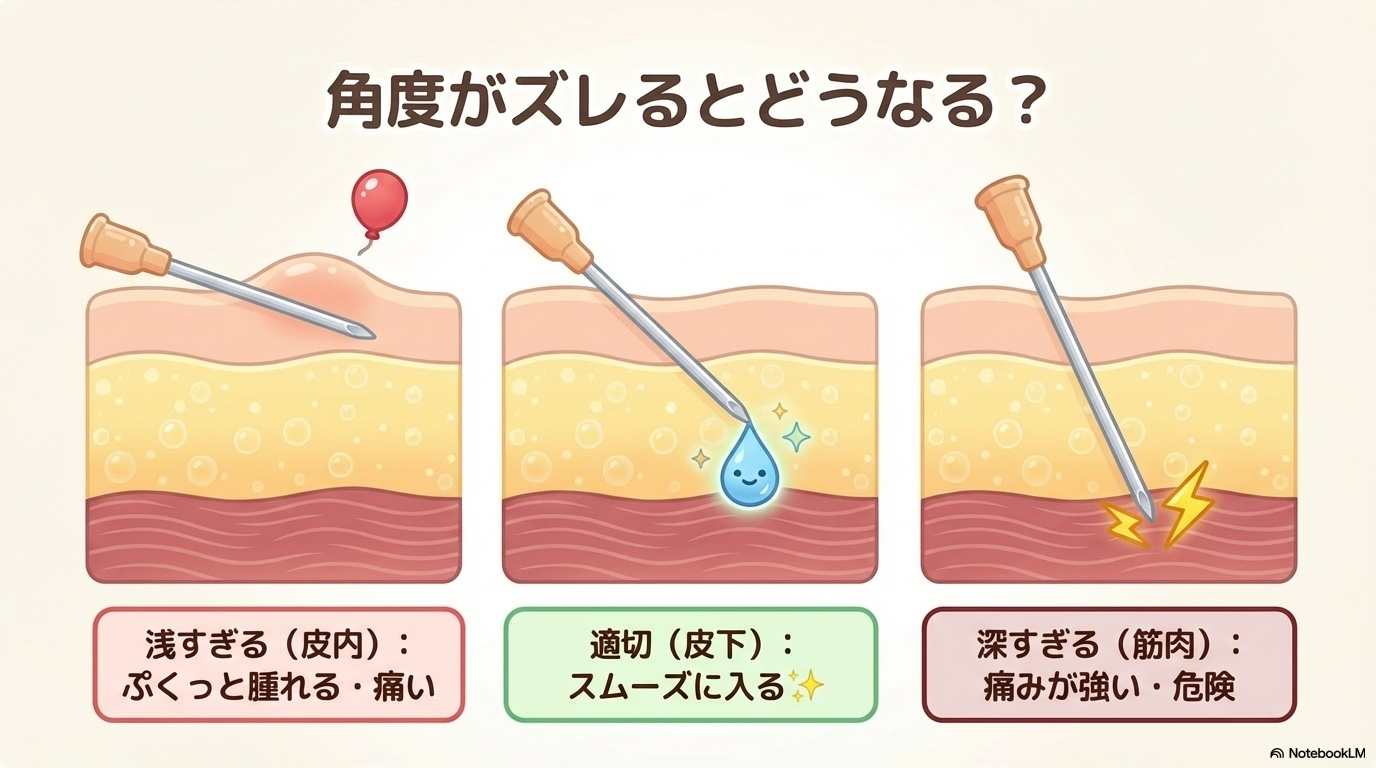 角度が浅すぎると、針先が皮下組織まで届かず、皮膚内(皮内)にとどまってしまいます。