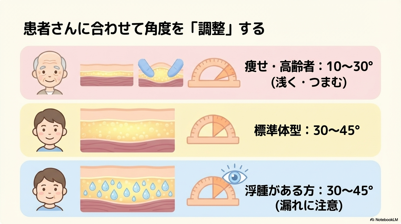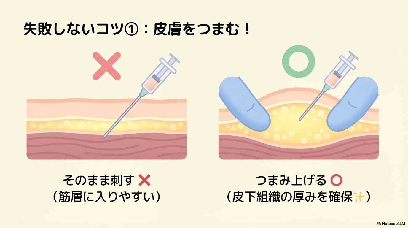 特に痩せている患者では、皮下脂肪が薄いため、そのまま刺すと筋層に入りやすくなります。