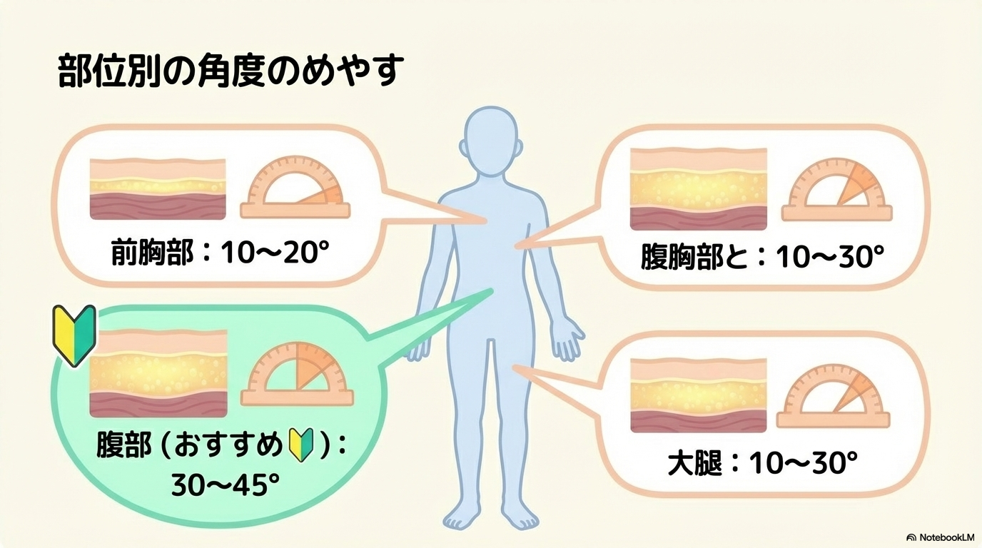 前胸部や大腿など、皮下脂肪が薄い部位では10〜30度程度の浅い角度で刺入することもあります。