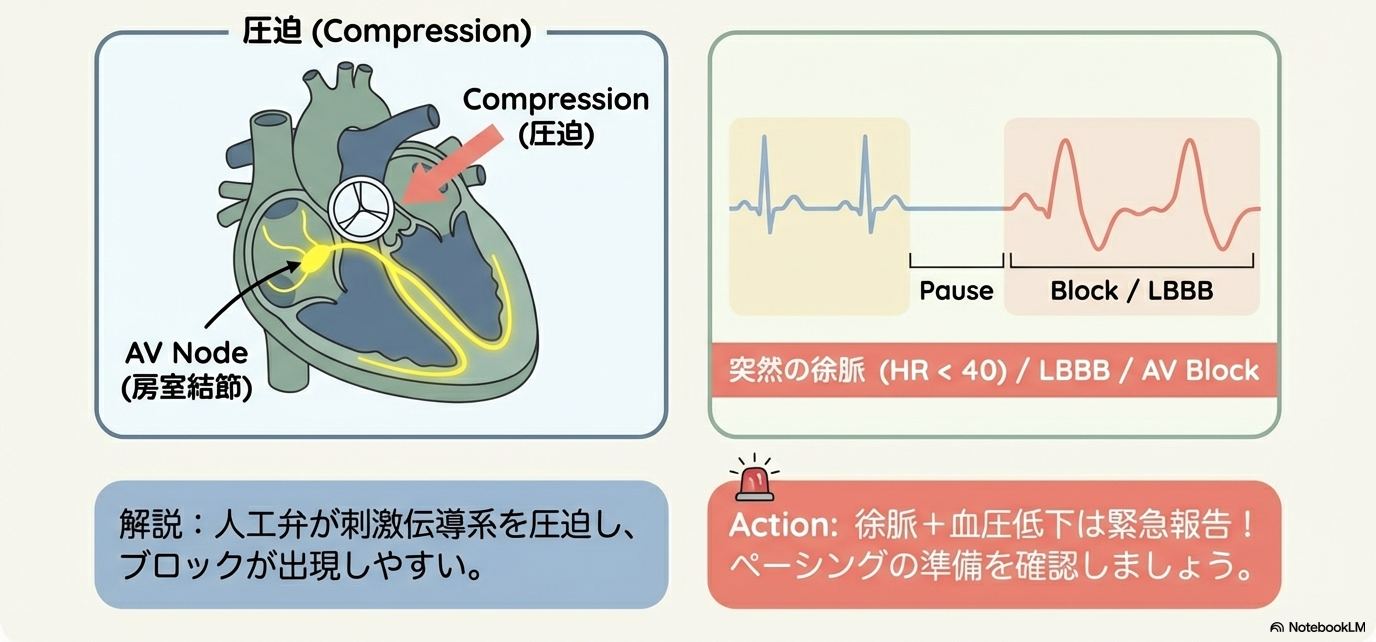 | PR延長・新規LBBB | 進行していないかトレンド確認 | モニタ強化、症状出現時は即共有 |